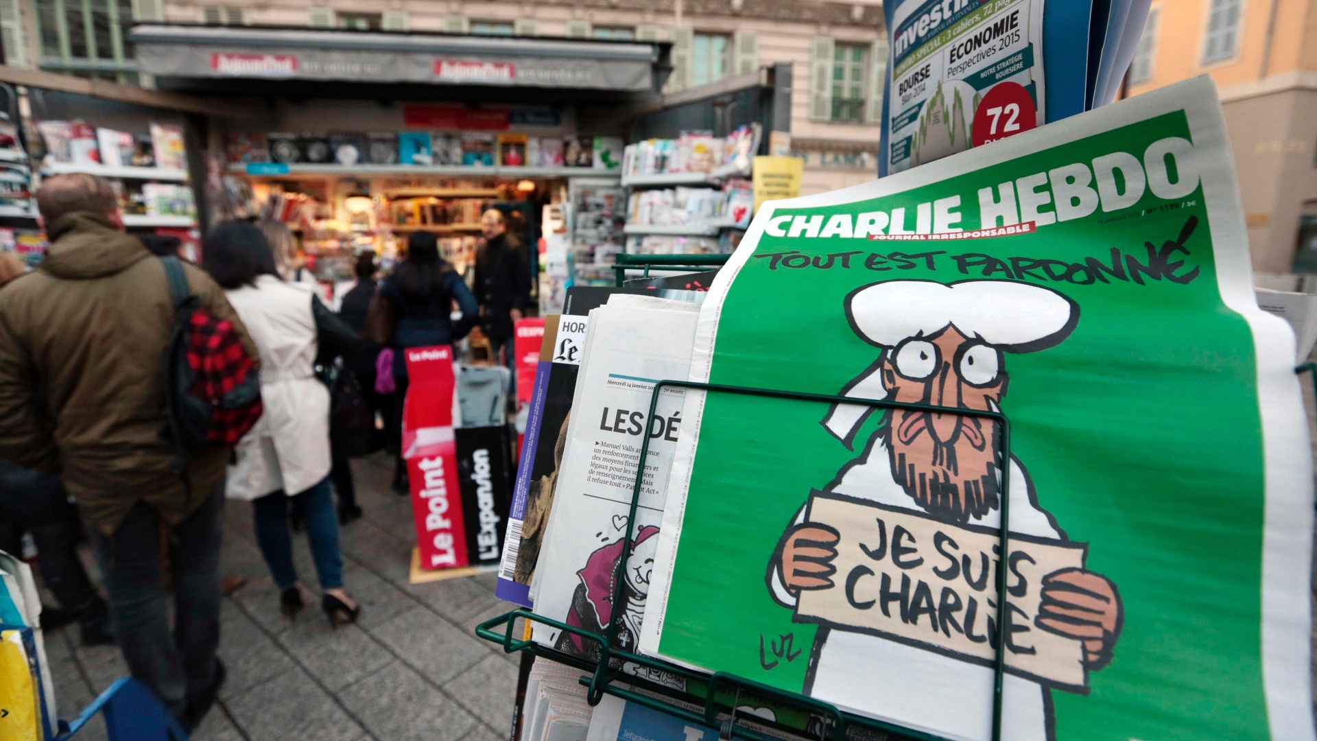 Ele carrega um cartaz com a frase "Je suis Charlie", "eu sou Charlie" - lema de apoio aos jornalistas. Excepcionalmente, a edição ficará à venda por duas semanas, em mais de 20 países.